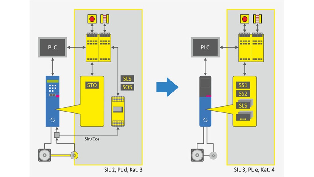 SE6 ermöglicht zusätzlich zu den Stoppfunktionen Safe torque off (STO), Safe stop 1 (SS1) und Safe stop 2 (SS2) auch Funktionen zur sicheren Bewegungsüberwachung. Die Funktionen Safely-limited speed (SLS) und Safe speed range (SSR) wachen darüber, dass der Antrieb die projektierten Geschwindigkeitsgrenzwerte nicht überschreitet. Safe direction (SDI) überwacht die projektierte Bewegungsrichtung, Safely-limited increment (SLI) begrenzt zuverlässig das Schrittmaß. Safe operating stop (SOS) überwacht den aktiven Stillstand. Das Thema Praxistauglichkeit stand bei der gemeinsamen Entwicklung mit der Firma Pilz GmbH & Co. KG im Vordergrund. So können alle Sicherheitsfunktionen bis SIL 3, PL e (Kategorie 4) eingesetzt werden.