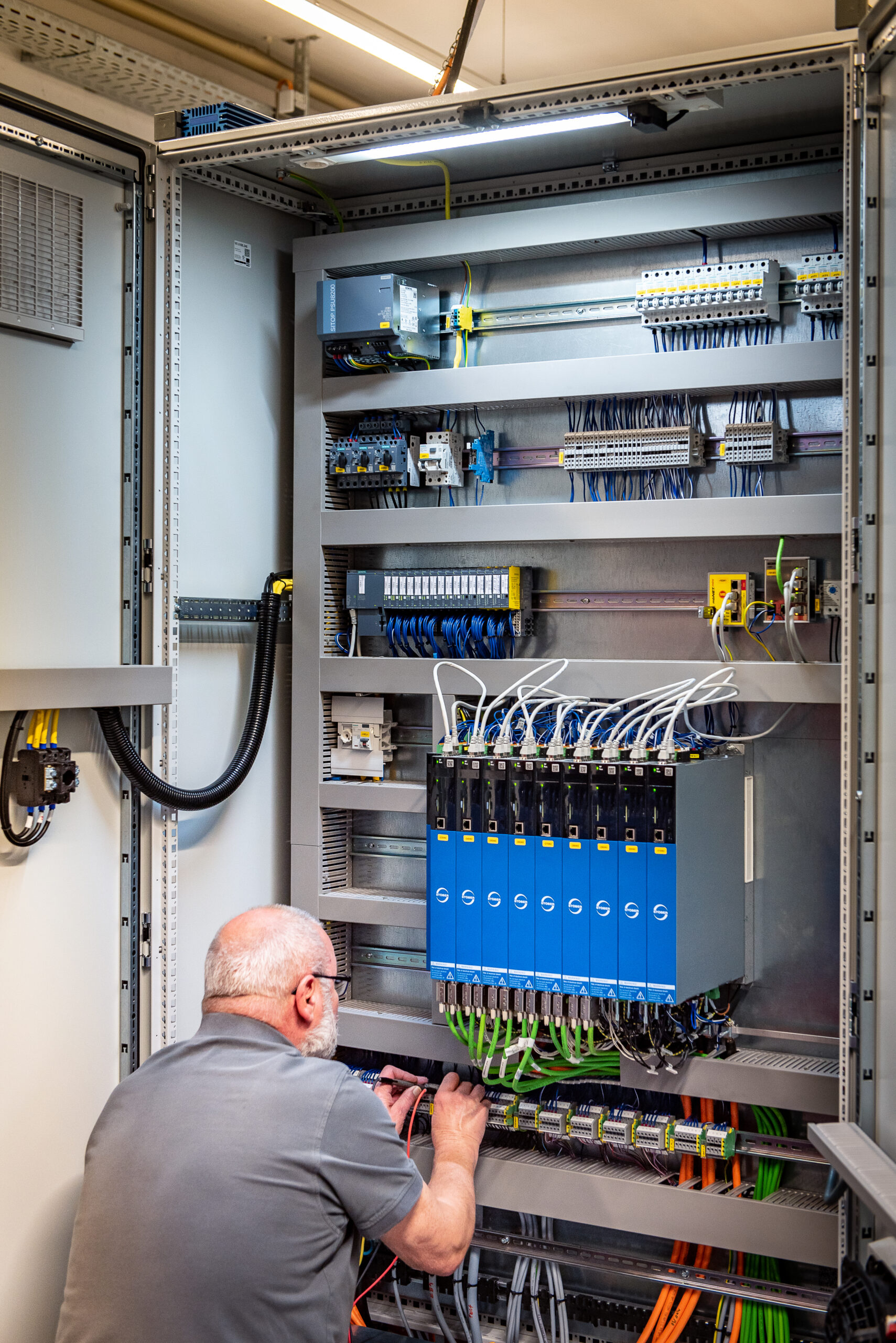 STÖBER hat die Motoren mit neun Doppelachsreglern aus der Baureihe SI6 kombiniert. Diese hochdynamische Lösung arbeitet auch bei anspruchsvollen Bewegungen zuverlässig im Hintergrund. Integriert sind die Sicherheitsfunktionen STO (Safe Torque Off) und SS1 (Safe Stopp 1), zertifiziert nach EN 13849-1 (PL e, Kat. 4). „Konzipiert ist der nur 45 Millimeter schmale Antriebsregler als Anreihgerät“, sagt Wittenauer. „Ein einzelner Antriebsregler kann bis zu zwei Achsen regeln. Durch eine Aneinanderreihung mehrerer Regler lässt sich die Anzahl der anzusteuernden Achsen frei skalieren.“ Die Installation der einzelnen Komponenten ist praktisch gelöst: Die patentierten Quick-DC-Link-Module ermöglichen das simple Einklicken von Standardkupferschienen zur Energieverteilung sowie die leichte Montage der Antriebsregler. STÖBER unterstützt zudem die Kommunikation über das Ethernet-basierte Feldbussystem PROFINET®.