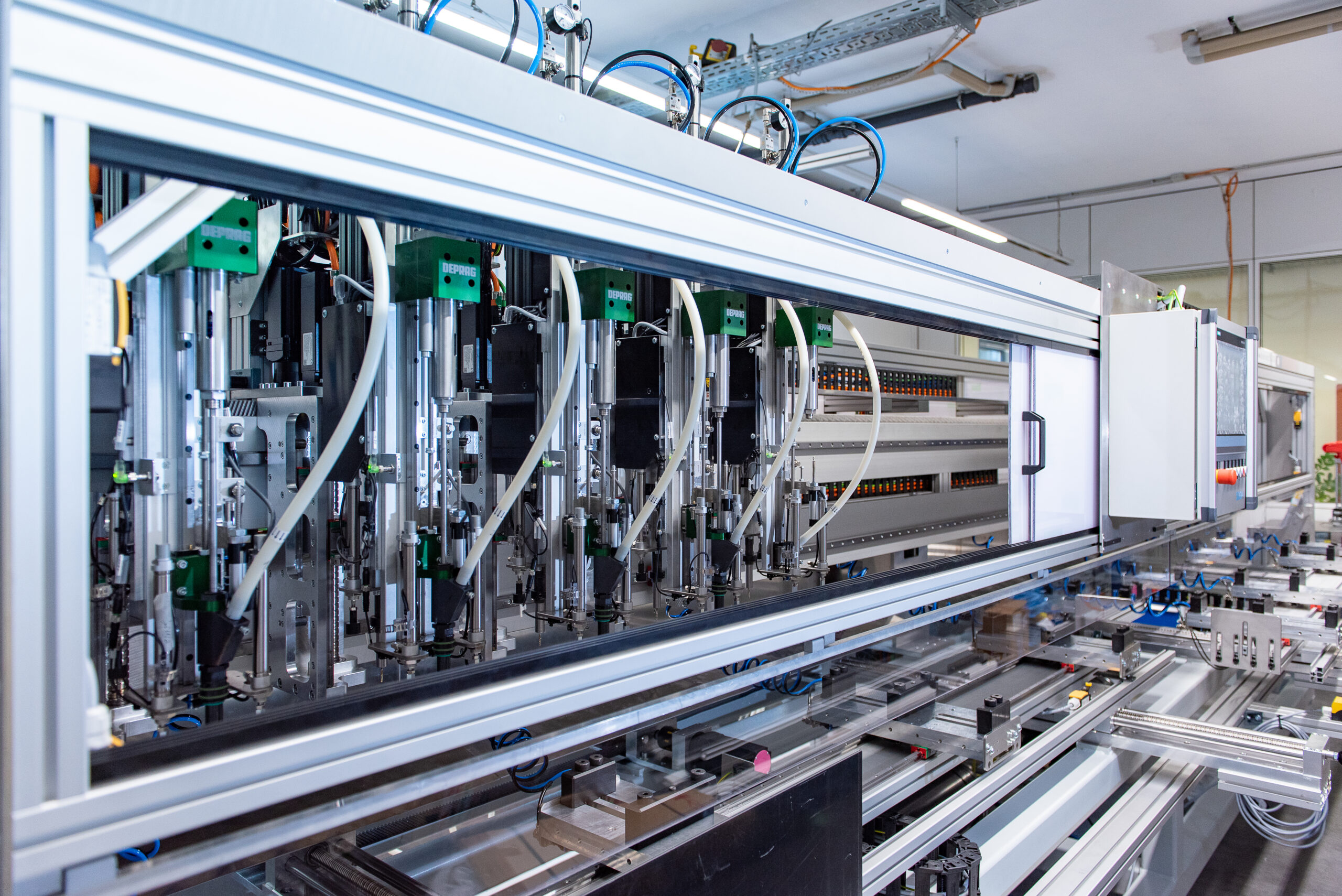 Die Anlage führt die Schrauben automatisch zu und verschraubt pneumatisch. Dazu ist der Automat mit fünf Montageköpfen ausgestattet, die auf einer Zahnstange unabhängig voneinander in X-Richtung verfahren. „Jeden Kopf haben wir mit einer Z- und einer Bohrachse ausgerüstet“, sagt Wittenauer. Für die X-Achse lieferte STÖBER Zahnstangengetriebe der Baureihe ZVPE sowie Synchron-Servomotoren des Typs EZ. Für die Z-Achse kommen ebenfalls EZ-Motoren mit Spindeltrieb zum Einsatz. Damit die fünf Köpfe auf der Zahnstange nicht miteinander kollidieren, haben die STÖBER Ingenieure einen dreifachen Kollisionsschutz implementiert – die Steuerung überwacht die Positionen zueinander, bei jeder X-Achse wurden die Software-Endschalter mit dem zulässigen Verfahrbereich parametriert, und zusätzlich befindet sich an jedem Kopf ein mechanischer Sicherheitsschalter.